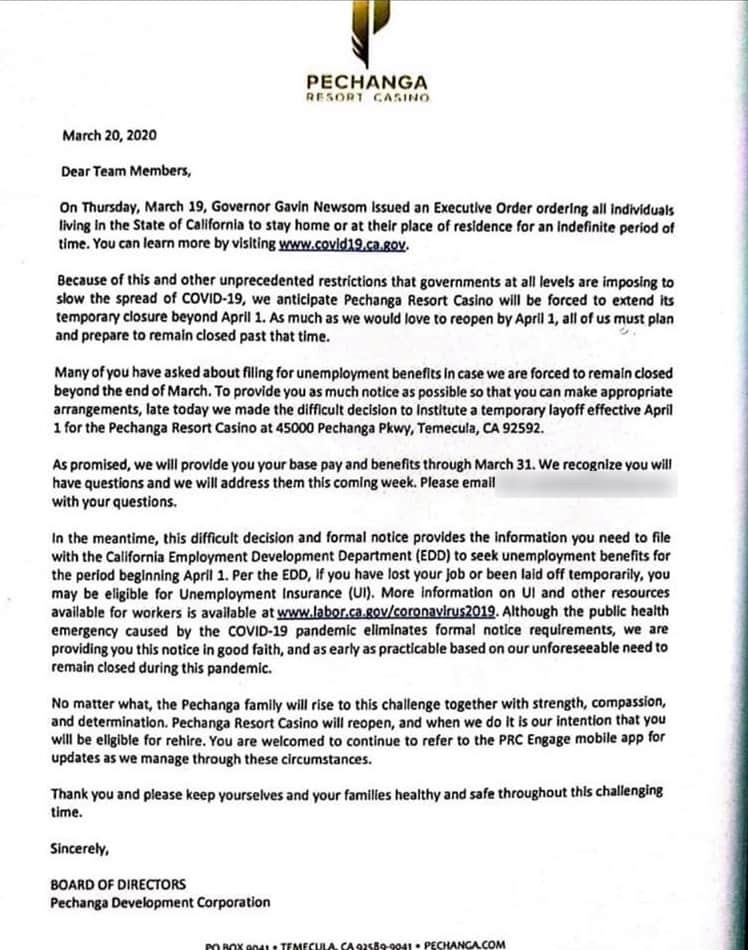 April 2nd UPDATE: A source in the Pechanga Public Relations Department informed us that team members were notified of the temporary closure on Saturday, March 14th via email through the companywide email system, and in shift briefings. After the closure was extended, emails were sent to company emails and personal email addresses. Employees received updates and had their questions answered through a company app during the closure, however they’ll only have access to this app until April 30th. Pechanga sent a formal notice which allowed team members to apply for unemployment benefits. On March 24th, Pechanga announced they would pay 100% of health insurance costs (medical, dental, vision) for all employees through April 30th.