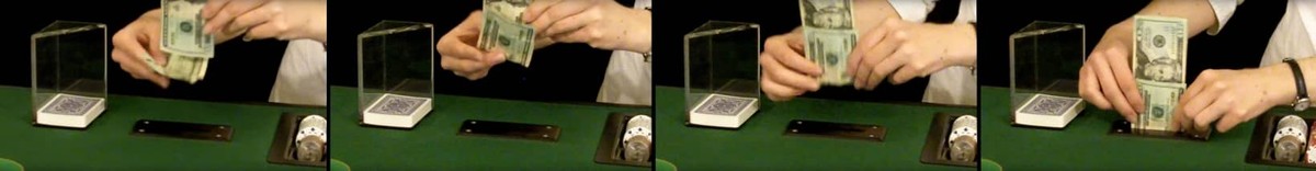 When the player hands you money you need to change it into cheques. Take the cash and spread it across the left side of the table with the back of the bill facing up and all the bills facing the same direction and down. Separate the different denominations.